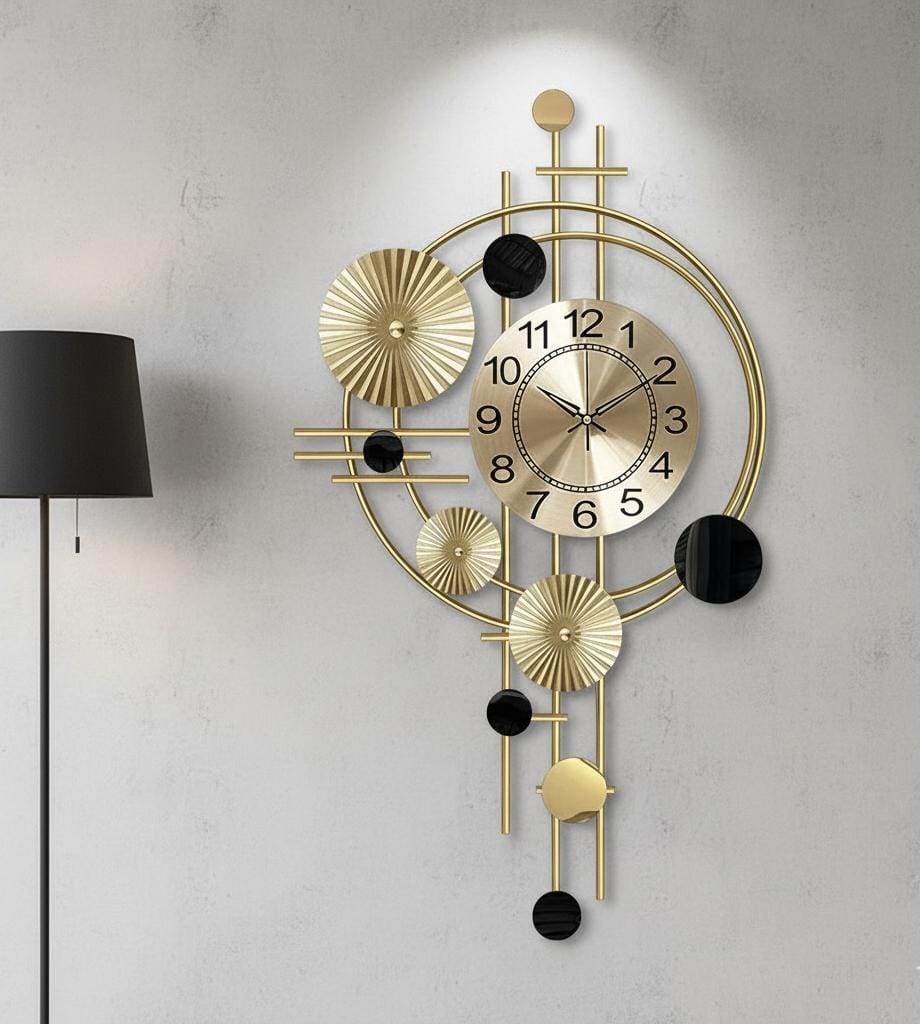 Crafted with precision, the clock features a radiant metallic finish complemented by circular and linear elements that create a perfect balance of art and function. The subtle blend of gold and black accents adds depth and contrast, making it a perfect centerpiece for contemporary interiors.