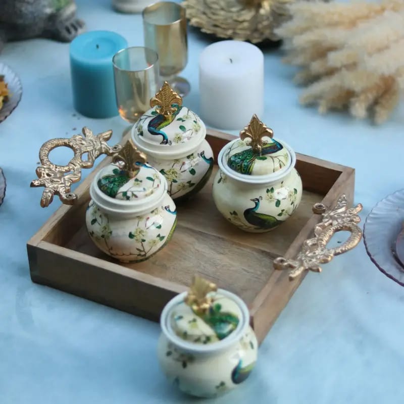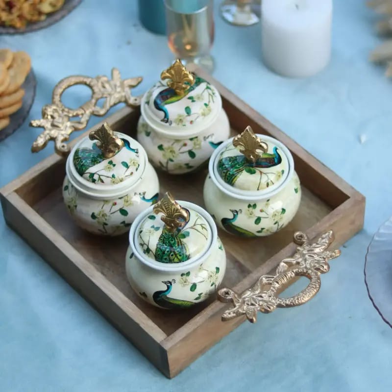 Bring home a touch of elegance with this Handcrafted Enamel-Coated Metal Peacock Jar . Designed to impress, each jar showcases a detailed peacock motif, highlighted with enamel coating and finished with luxurious golden lid handles. Perfect for storing spices, dry fruits, sugar, or condiments, this jar is also a stunning centerpiece for your table setup.
