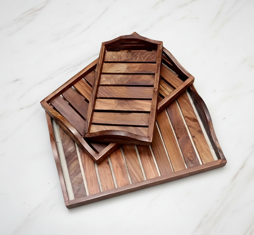 Elevate your dining experience with our handcrafted wooden trays, designed to bring natural elegance to your table. Made from premium quality wood, these trays are durable, eco-friendly, and finished with a smooth polish that highlights their rich grain. Perfect for serving snacks, appetizers, desserts, or even main courses, they add a rustic yet sophisticated charm to any setting. Lightweight yet sturdy, our trays are easy to handle and clean, making them a practical choice for everyday use or special occasions. Whether hosting guests or enjoying a cozy meal, these wooden trays are a timeless addition to your serveware collection.