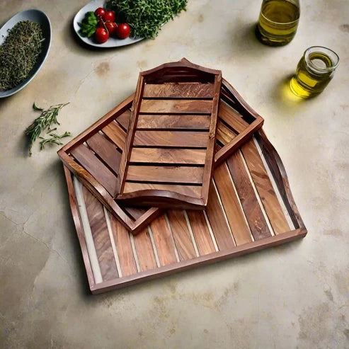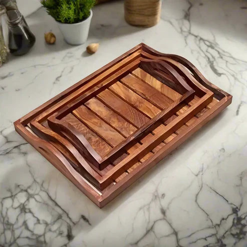 Handcrafted Wooden Sheesham Wood Trays - Set of 3 - Small, Medium, Large