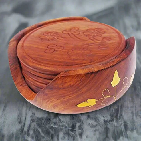 Sheesham Wood Coaster Set with Brass Flower - 4 inch x 4 inch x 2 inch