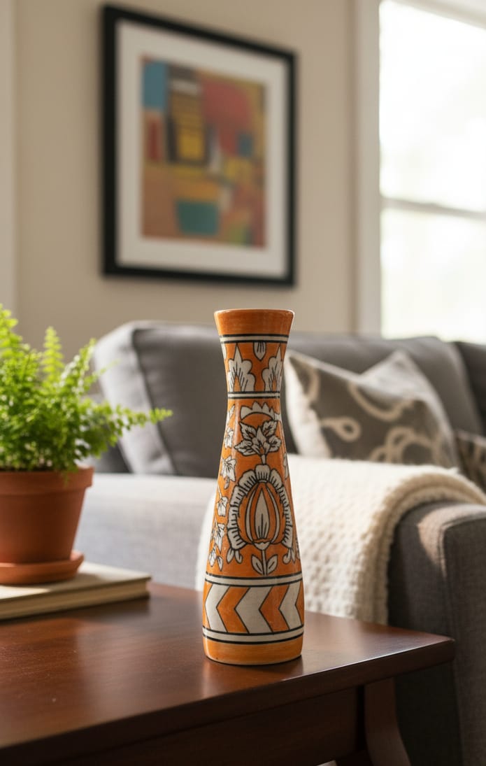 Elevate your home décor with this striking, hand-painted ceramic vase. Featuring a vibrant, intricate pattern of orange, white, and black, this piece is more than just a vessel for flowers—it's a work of art in its own right. Its elegant, tall silhouette is perfectly designed to showcase a fresh bouquet, instantly becoming the focal point of your hall room, living room, or entryway. The warm, cheerful colors and meticulous detailing add a touch of handcrafted elegance and timeless charm to any modern or traditional interior.