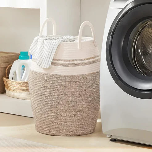 White & Beige Sleek Laundry Storage Basket with Handles - Medium, Large