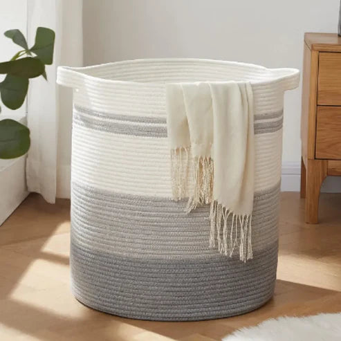 - Enhance your home with our White and Grey Cotton Rope Basket - combining practicality with a contemporary aesthetic!
